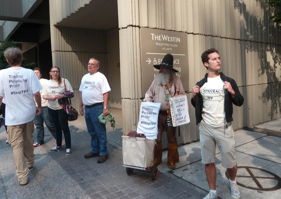 And as the ministers began meeting Wednesday, a handful of protestors marched through the lobby of the hotel chanting "No TPP! Stop Corporate Greed."