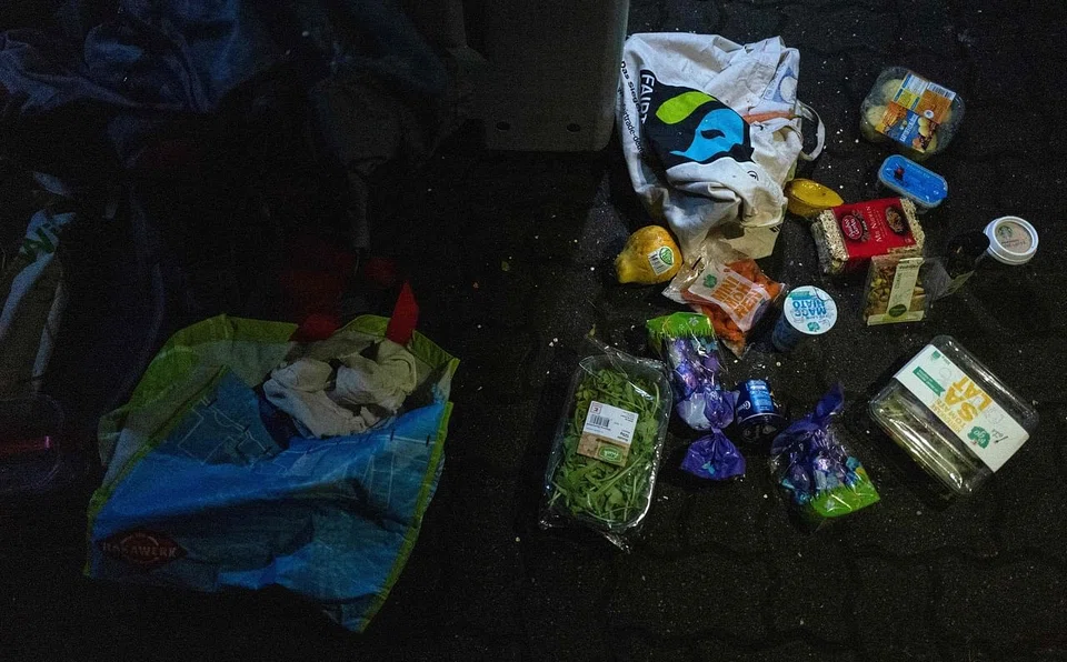 After a few steps, he reaches his target -- a rubbish bin overflowing with pasta, tropical fruits and truffle olive oil, all still in their packaging and, at least visibly, ready for consumption.