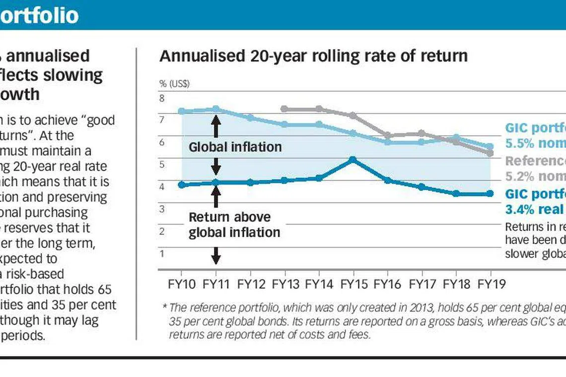 GIC is also mindful of risks embedded in the portfolio, with the 20-year nominal return reflecting a volatility of 8.9 per cent, lower than most market portfolios, said Mr Lim. Furthermore, this 8.9 per cent is lower than that in GIC's reference portfolio - a portfolio that reflects the risk GIC's client, Singapore's Ministry of Finance, is prepared for GIC to take in generating long-term investment returns - which stood at 10.6 per cent over the same period.