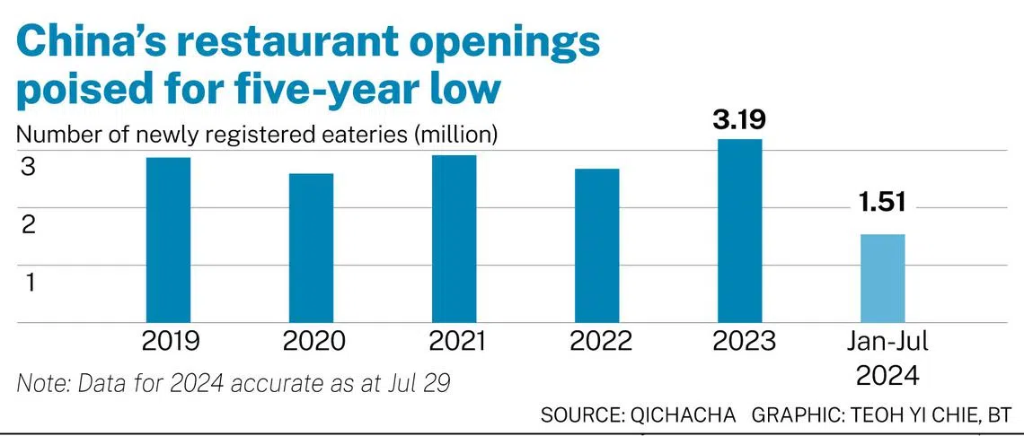 From May 10, 2023 and July 21 this year, more than 1,400 restaurants with an average spend of more than 500 yuan (S$91.70) per person in Shanghai were shuttered, driving down the proportion of fine dining restaurants to just 0.59 per cent of the city’s total eateries, according to data from industry tracker Hongcan.