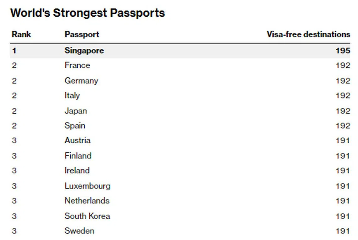 Having a Singapore passport means getting visa-free entry to a record 195 global destinations, putting the city state at the top on the Henley Passport Index. The four European countries, which held the No 1 spot earlier in the year, are now in second place along with Japan.