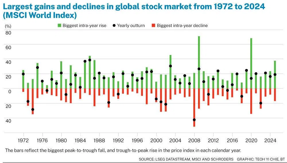Based on the MSCI World Index, stocks fell by an average of 15 per cent and rose 23 per cent each year from 1972 to 2024.