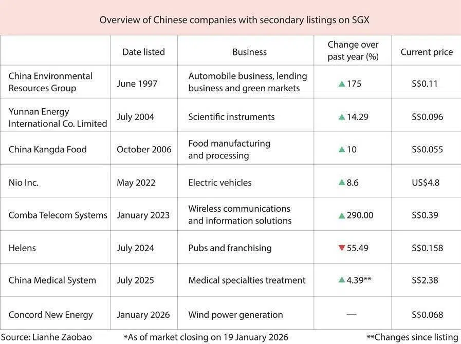 Recent Chinese companies obtaining secondary listings in Singapore include pharmaceutical firm China Medical System and wind power company Concord New Energy – their share prices rose by around 10 per cent on their first day of trading here.