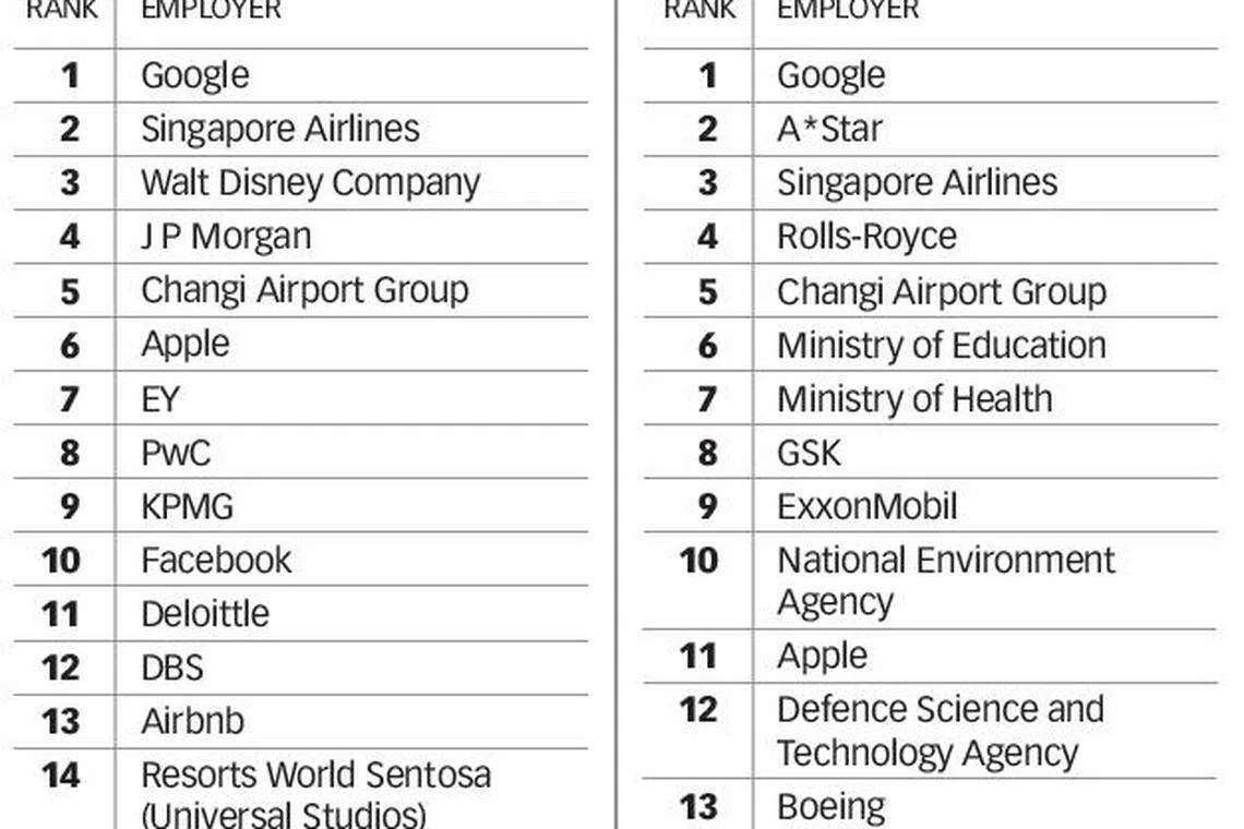 FOR the third straight year, business and commerce students in Singapore's four main universities picked Google as the best company to work for. The US tech giant also knocked down the government's leading scientific research agency, A*Star, to second place to regain top choice among engineering and natural sciences students in this year's ranking of 100 ideal employers in Singapore.