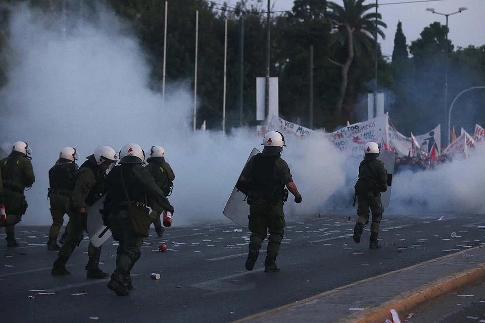 [ATHENS] Greek riot police fired tear gas to disperse petrol bomb-throwing protesters in Athens Sunday as thousands took to the streets in anti-austerity demos ahead of a vote by lawmakers on a controversial tax and pensions overhaul.