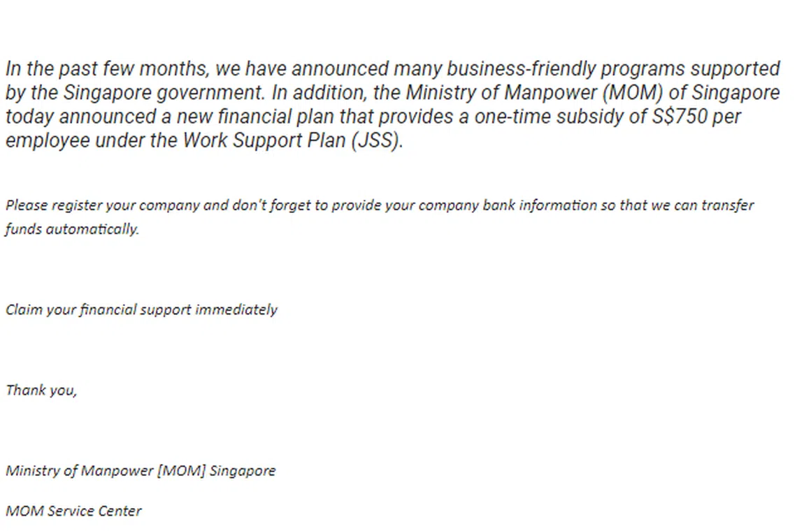 This e-mail will be sent from a spoofed MOM account announcing a fake government initiative to give businesses an additional one-time subsidy of S$750 per employee, it added.