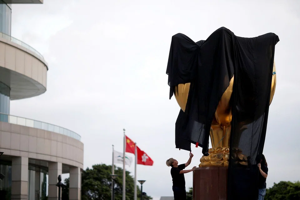 [HONG KONG] Hong Kong pro-democracy protesters on Monday draped a black flag over a statue symbolising the city's return to China by Britain, days before a visit by President Xi Jinping to mark 20 years since the handover.