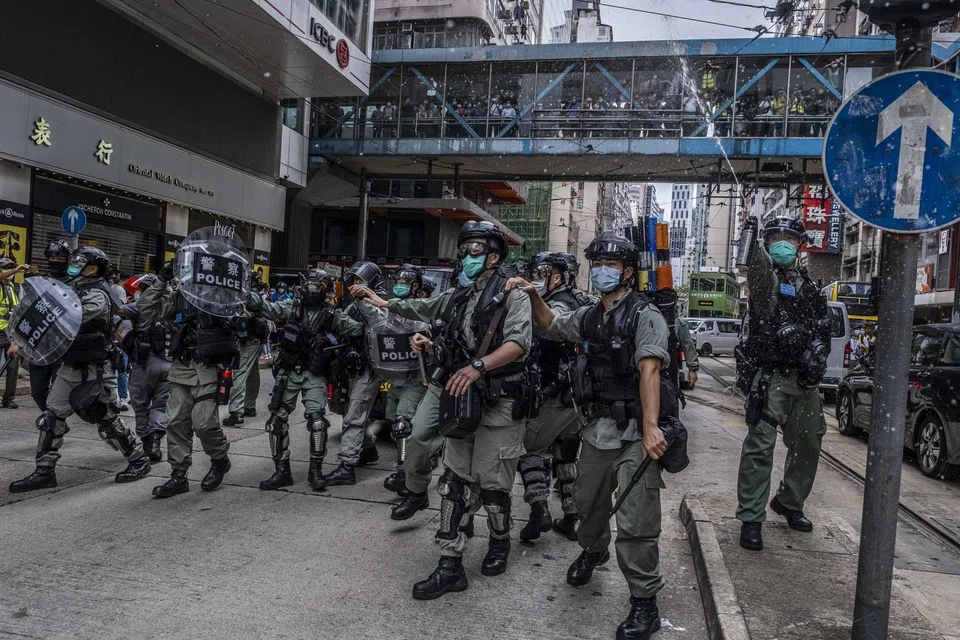 POLICE fired tear gas and water cannon at thousands of Hong Kong pro-democracy protesters who gathered on Sunday against a controversial security law proposed by China, in the most intense clashes for months.