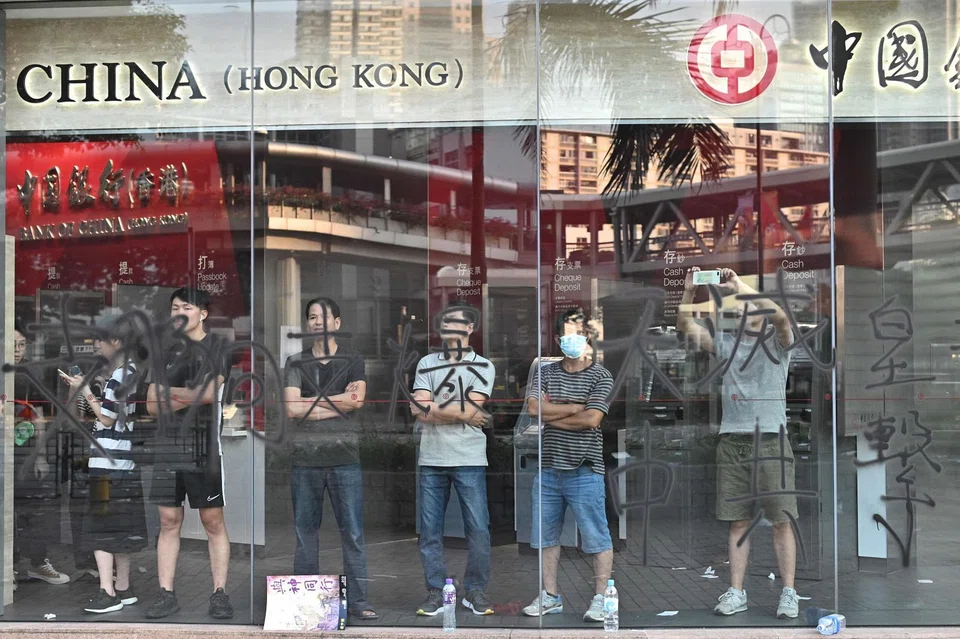 Protesters took aim at some of China's largest banks at the weekend, spray-painting anti-China slogans on shuttered branches and trashing ATM machines of outlets such as Bank of China, while nearby international counterparts such as Standard Chartered escaped untouched.