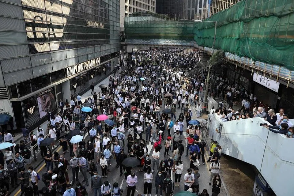 Around 1,000 protesters blocked roads in the heart of the city's Central business district during the lunchtime rush hour. Wearing now-banned face masks and dressed in office wear, they marched and hurled bricks onto roads lined with some of the world's most expensive real estate and luxury flagship stores.