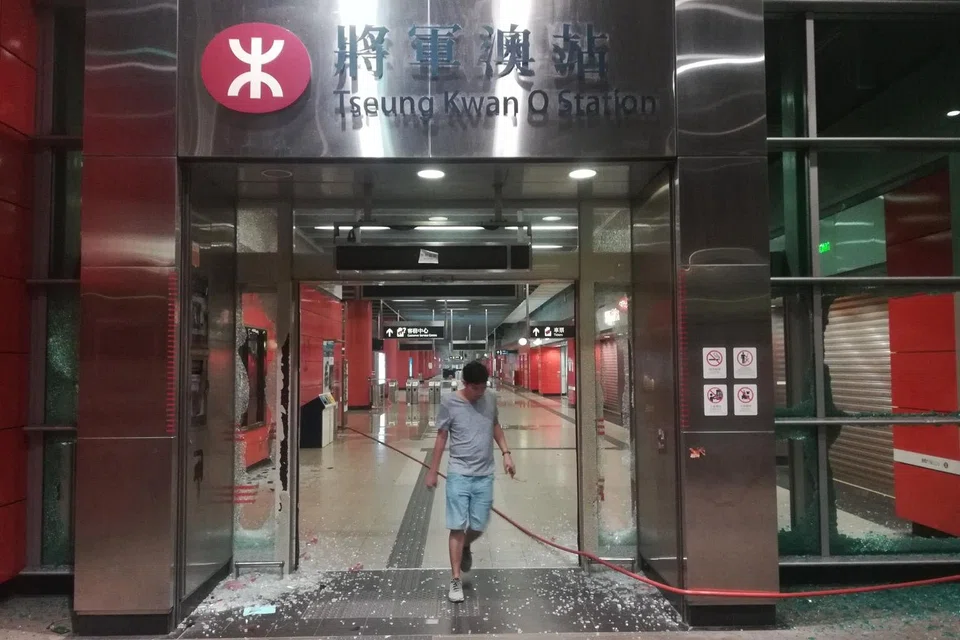 Some protesters tore down pro-China banners before clashes erupted throughout the evening. Police used tear gas in multiple locations to disperse protesters who had taken over roads, vandalised subway stations, set street fires and trashed pro-China businesses.