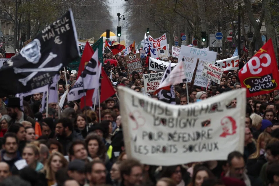 [PARIS] Hundreds of thousands of French protesters took to the streets on Tuesday in a pension reform standoff that has sparked nearly two weeks of crippling transport strikes, with the government vowing it will not give in to union demands to drop the overhaul.