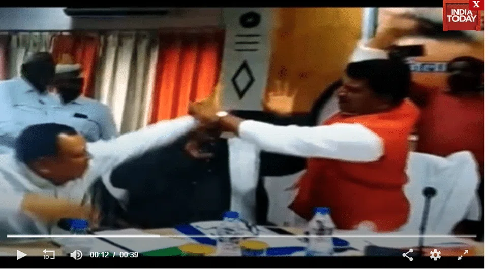 Footage of the altercation in the northern state of Uttar Pradesh, dubbed the "shoe brawl" by Indian media, shows MP Sharad Tripathi beating state assembly member Rakesh Singh Baghel with his slipper after an argument over the placement of names on a foundation stone for a new project.