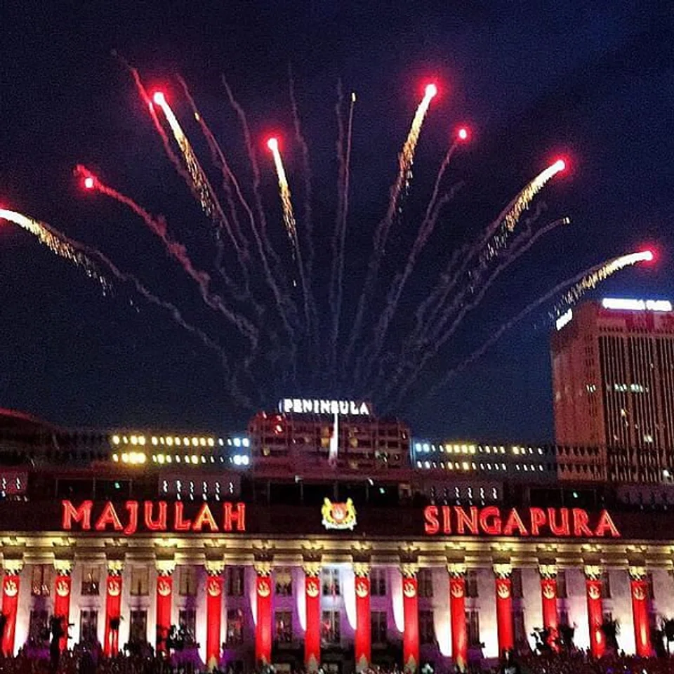 The festivities were capped by the biggest pyrotechnics display ever to light up the Singapore skyline, consisting of never-before-seen fireworks such as a 300m long rainbow arc and fireworks in the shape of orchid flowers, a smiley face, a heart shape, the crescent moon and stars, and a continuous blast of fireworks lasting 4-5 minutes as a grand finale.