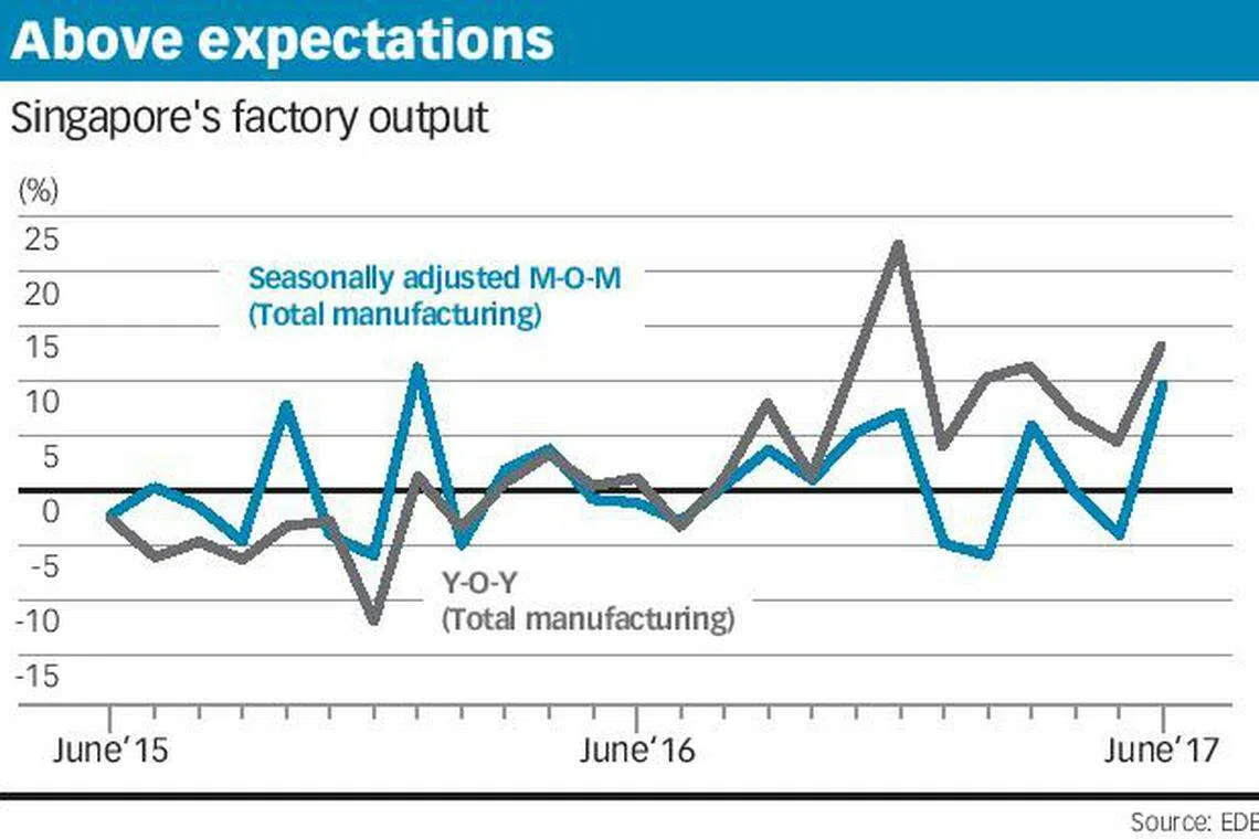 In June, the headline manufacturing output of 13.1 per cent was boosted by the biomedical manufacturing cluster, which roared back to life with a year-on-year growth of 18.3 per cent.