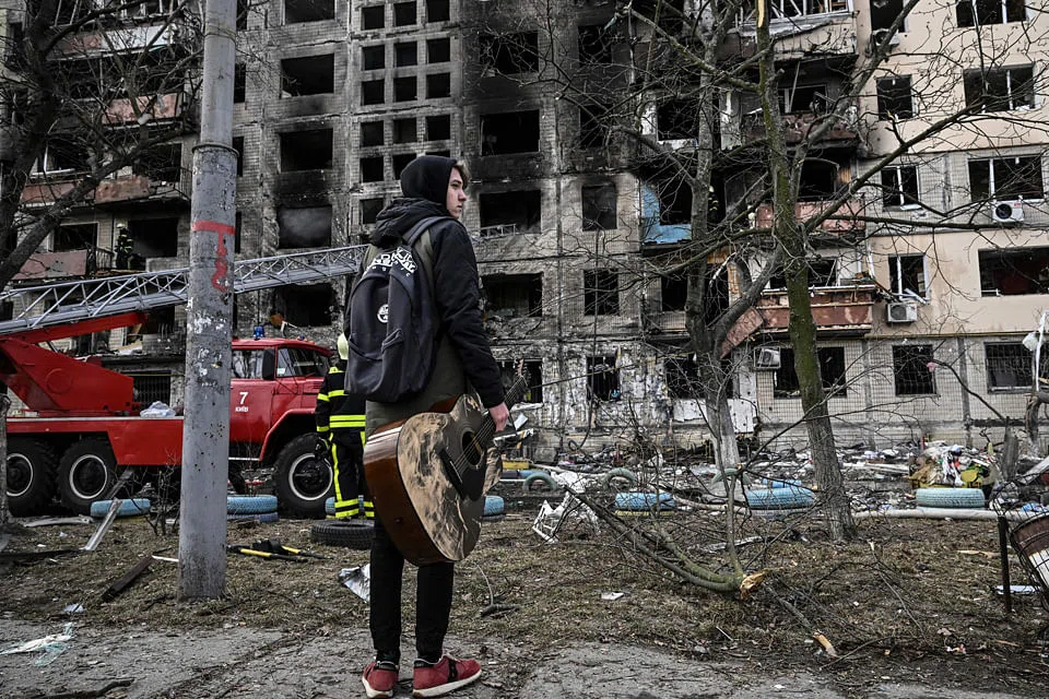 Firefighters tackled the remains of a blaze at the damaged apartment block in the capital, where a stunned young resident described the chaos of the previous night in a city targeted by the Russian advance but so far largely spared bombardment.