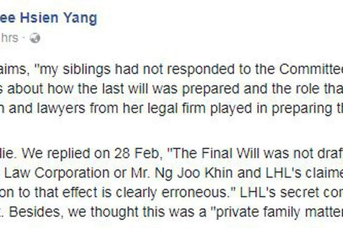In his latest Facebook post on Friday morning, the younger Lee said: "Loong claims, 'my siblings had not responded to the Committee's questions about how the last will was prepared and the role that Mrs Lee Suet Fern and lawyers from her legal firm played in preparing the last will'.