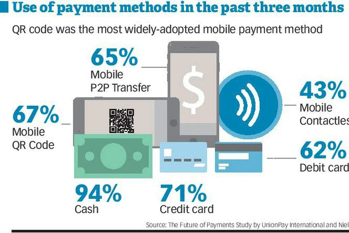 The good news is, mobile payment methods had their fair share of usage as well. QR code has become the most widely-adopted mobile payment method - 67 per cent of Singaporeans had used it in the past three months. This was followed by mobile peer-to-peer transfer at 65 per cent, and mobile contactless payment at 43 per cent.