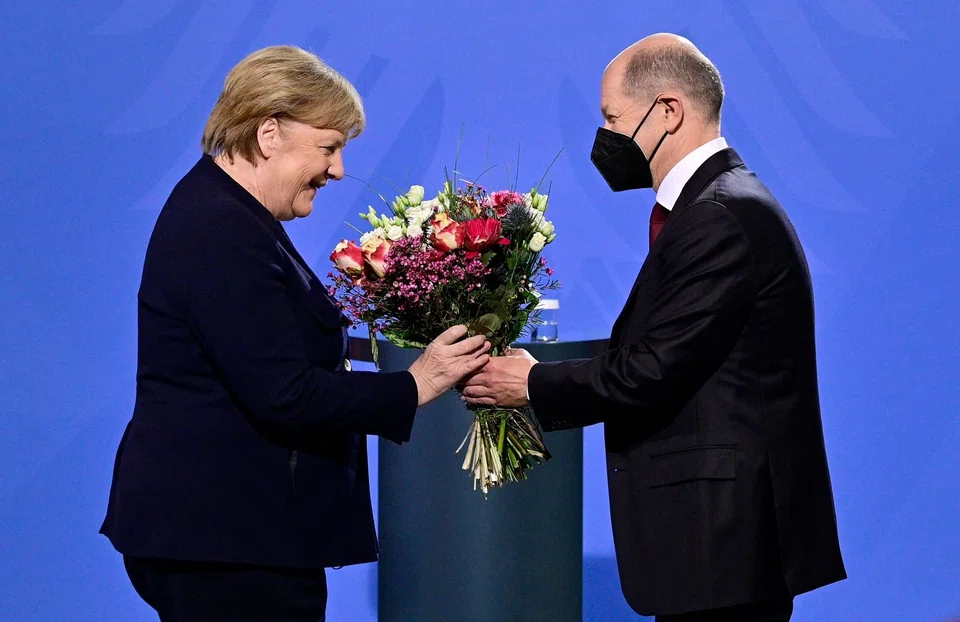 Merkel accompanied key moments of a highly symbolic day when Scholz and his coalition of SPD, Greens and the liberal FDP officially took power.