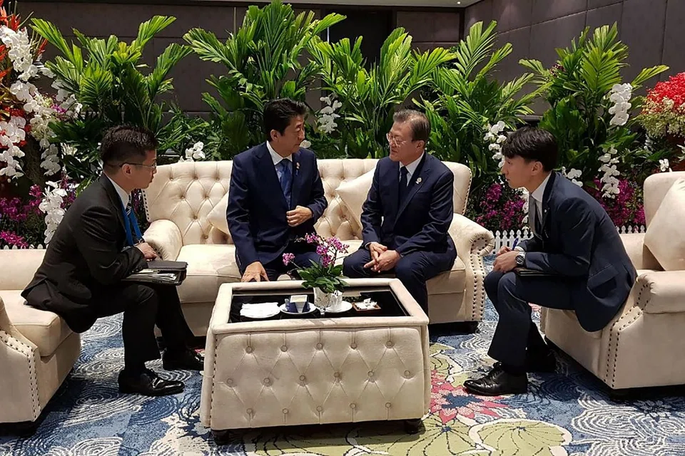 As the feud spilled over into trade and security issues, Mr Moon and Mr Abe have not held a summit for more than a year, though they shook hands at a Group of 20 leaders' meeting in Japan in June.