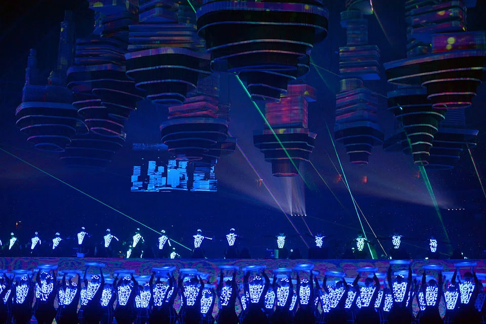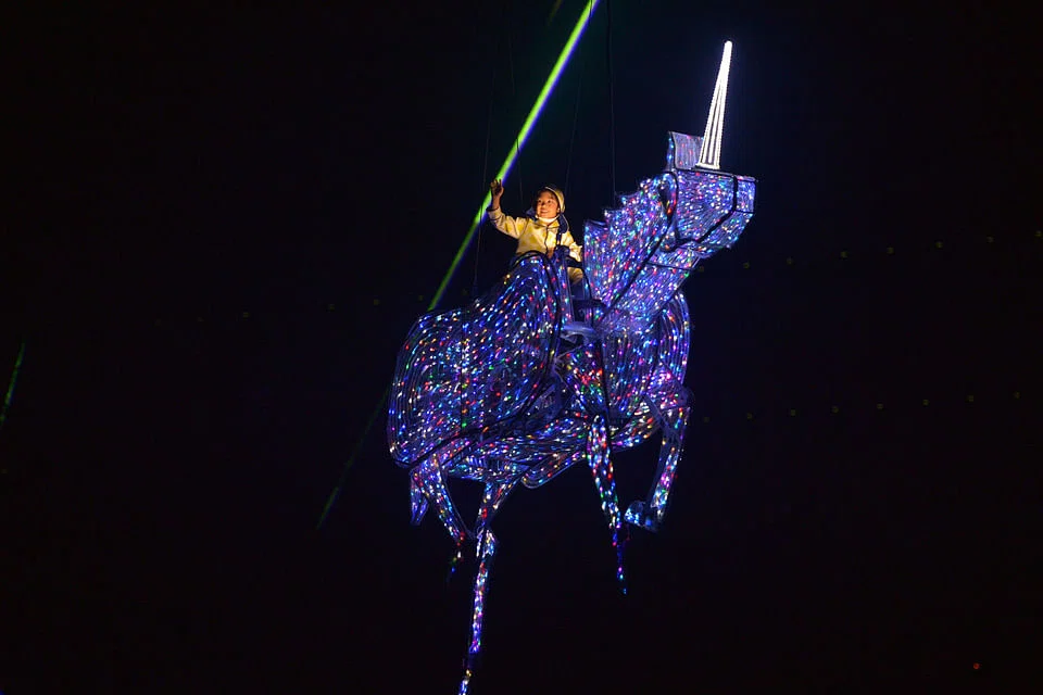 The enclosed arena and domed roof of the Sports Hub - which is hosting its inaugural NDP - allowed for more aerial performances, such as floating structures evoking a futuristic "sky city", and spinning, soaring dancers as they retold the story of Malay legendary folk hero Badang.