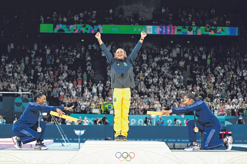 For the first time in Olympic gymnastics history, three Black athletes shared a podium, with Rebeca Andrade of Brazil earning gold in the women’s floor exercise final, Simone Biles receiving silver and Jordan Chiles taking bronze. At one point, while they were on the podium, Biles and Chiles, both of the US, bowed down to Andrade.