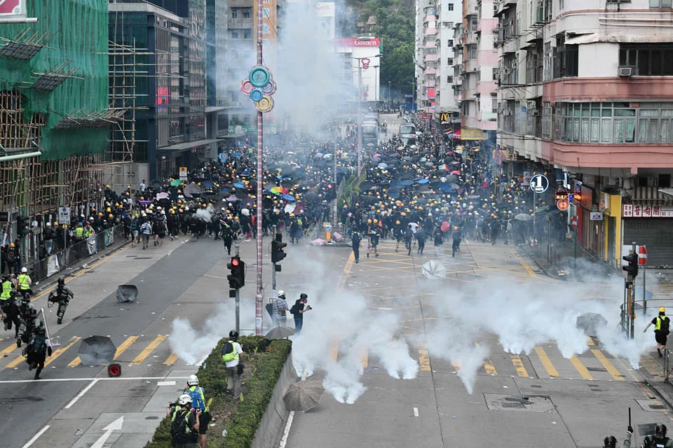 Riot police fired volleys of tear gas at crowds of mostly young protesters outside a police station in the working class district of Sham Shui Po. In nearby Cheung Sha Wan, protesters threw objects at police who fired back with tear gas.