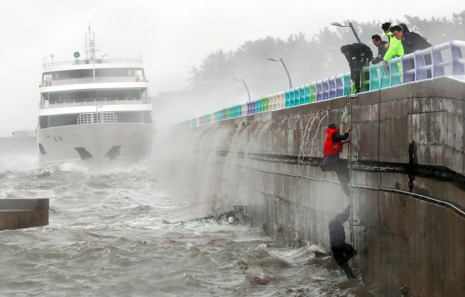 Dramatic footage aired by the YTN news channel showed six crew members from a docked ferry being swept off a pier and into the sea by a giant wave in the southern port of Yeosu. All six were later rescued.