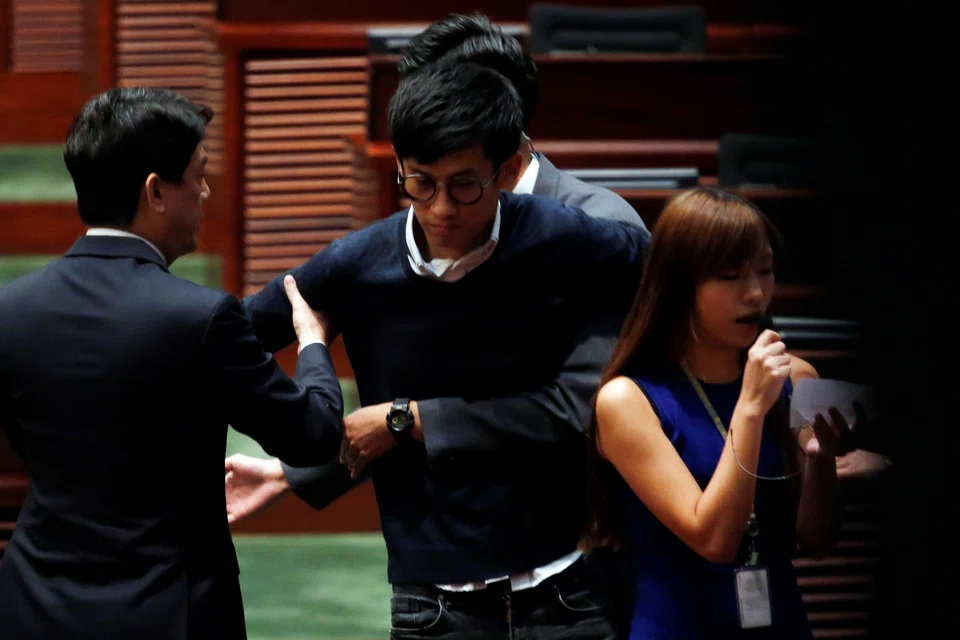 [HONG KONG] Two lawmakers who want Hong Kong to split from China wrestled with security in parliament Wednesday, with one of them dragged from the chamber, as fears grow Beijing will step in over the saga.