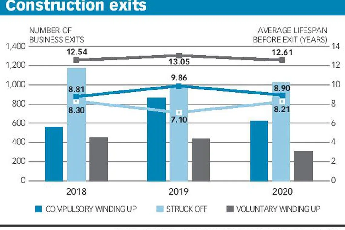 A total of 1,951 construction companies exited the sector last year, according to data analysis firm Handshakes's study of information from the Accounting and Corporate Regulatory Authority (Acra).