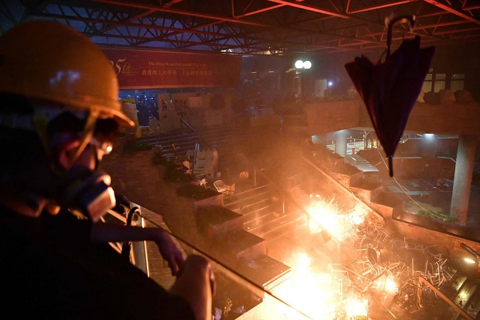 [HONG KONG] Pro-democracy demonstrators holed up in a Hong Kong university campus set the main entrance ablaze Monday after surrounding police warned officers they may use live rounds, deepening fears over how nearly six months of unrest across the city will end.