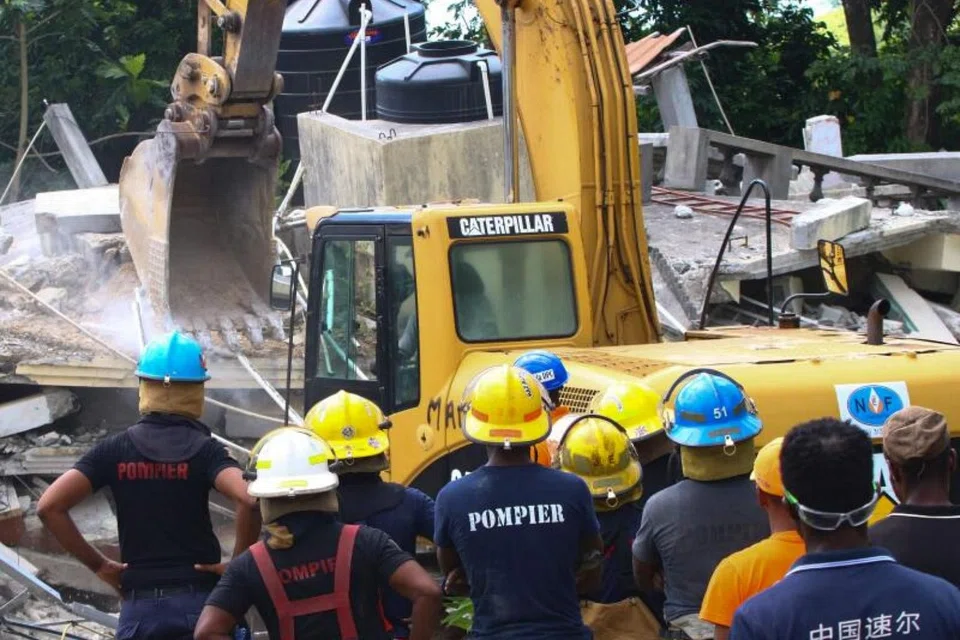 In Les Cayes, a seafront town of some 90,000 people, rescuers in red hard hats and blue overalls pulled bodies from the tangled wreckage of one building, as a yellow mechanical excavator nearby helped to shift the rubble.