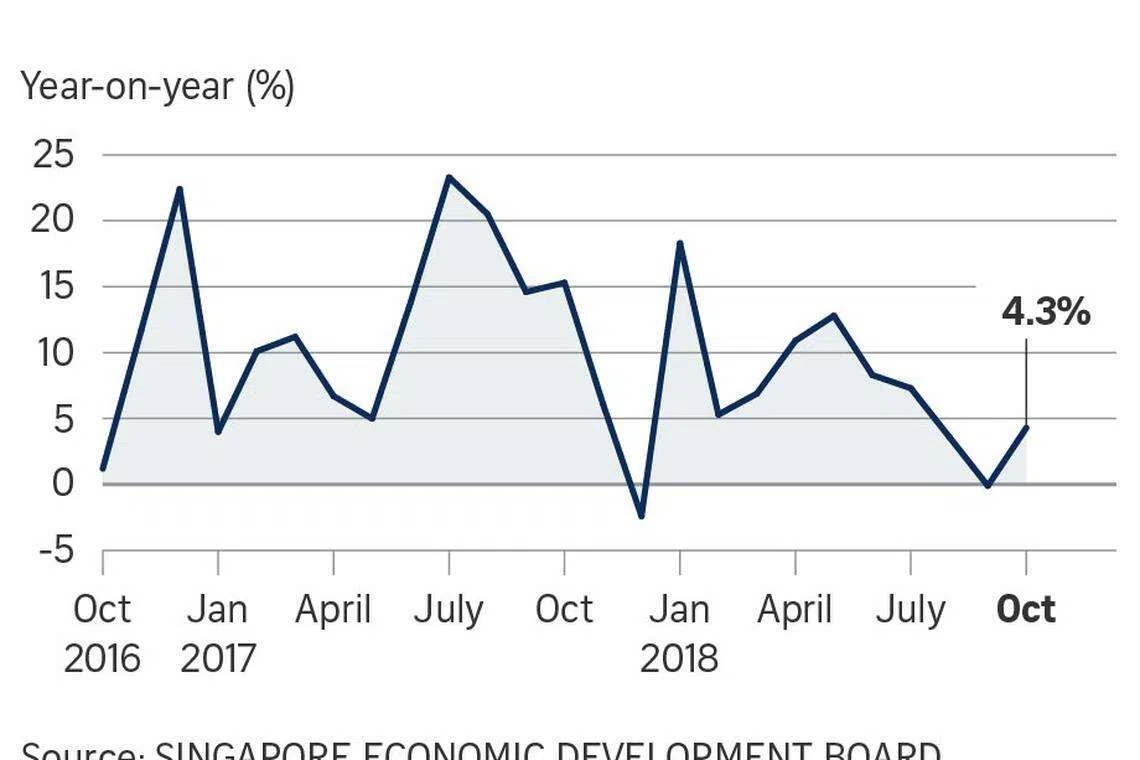 SINGAPORE'S manufacturing output grew 4.3 per cent year on year in October, more than rebounding from September's marginal 0.1 per cent fall and exceeding economists' expectations of 2.6 per cent growth, according to preliminary estimates from the Economic Development Board on Monday. Excluding the volatile biomedical manufacturing sector, output grew 3 per cent.