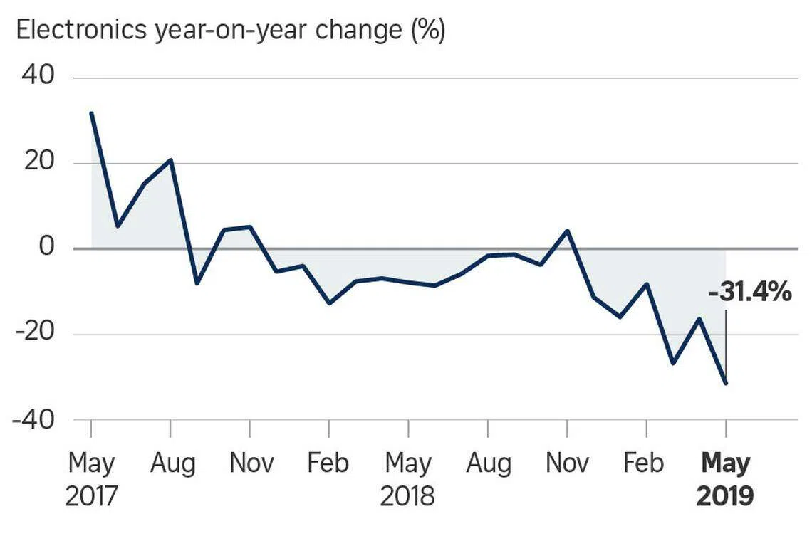 The dismal showing in May came on the back of declines in both electronic and non-electronic shipments.