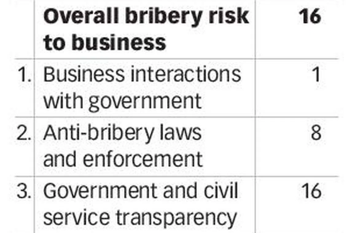 SINGAPORE has emerged 13th in a field of 200 countries, ranked according to the risk of encountering commercial bribery.