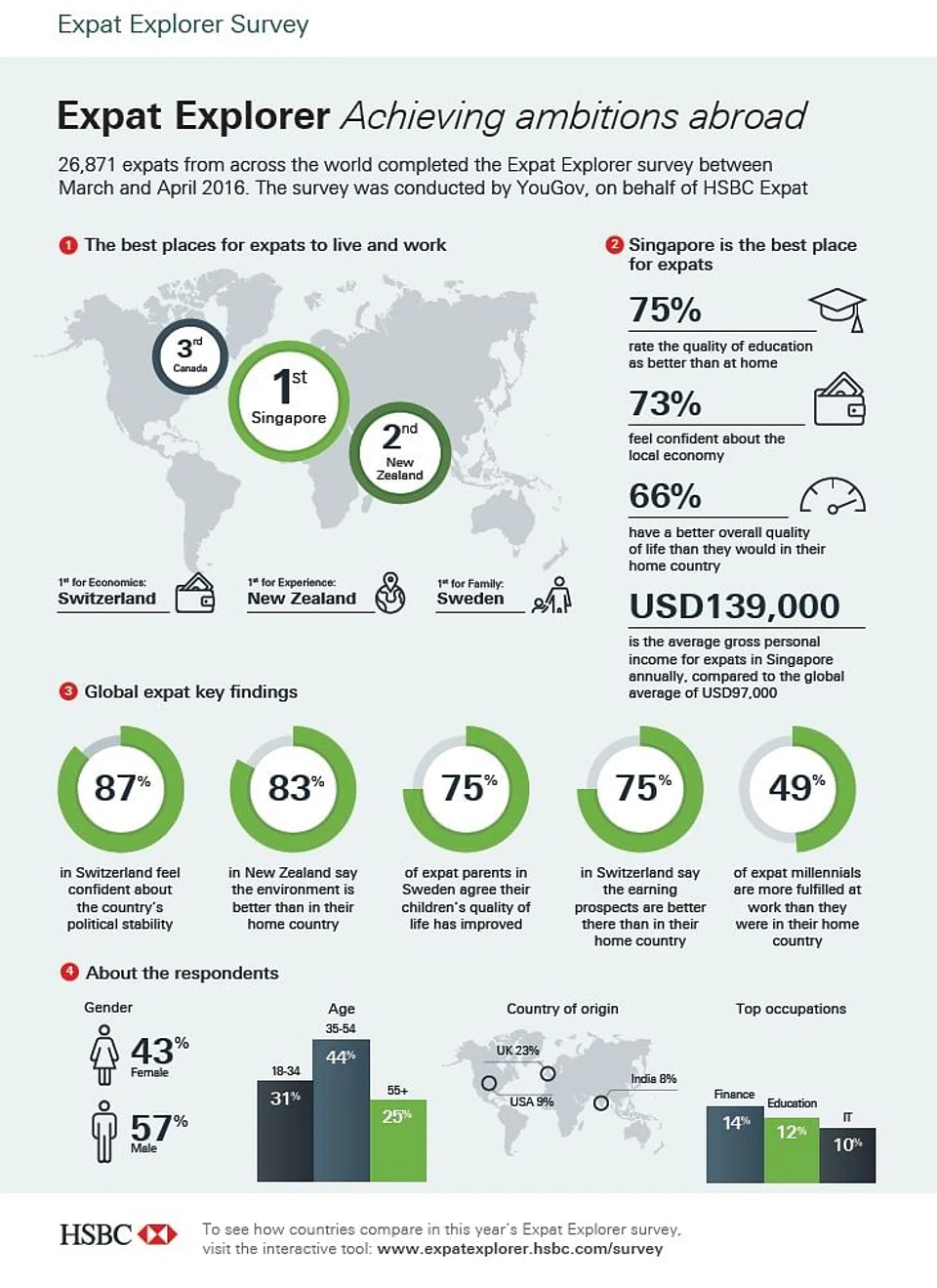 HSBC Expat Explorer is the largest and one of the longest-running surveys of expats, with 26,871 respondents from 190 countries and territories (including 533 from Singapore) sharing their views on life abroad including careers, financial wellbeing, quality of life and ease of settling for children.