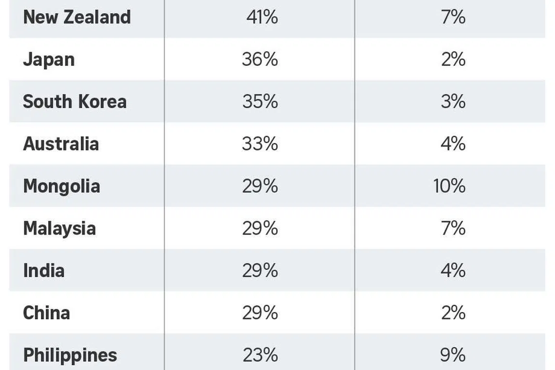 Hong Kong is second at 43 per cent and Taiwan is third at 42 per cent.