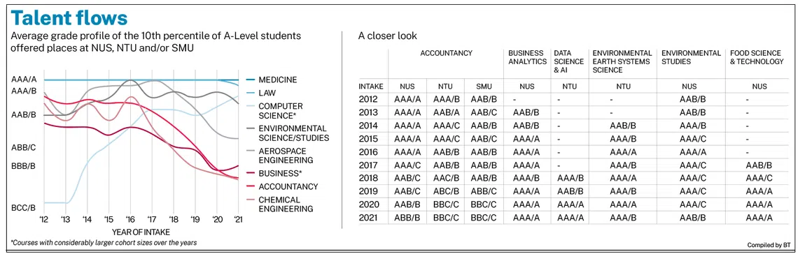 INDICATIVE grade profiles at local universities suggest that Singapore’s brightest young minds have had a change of heart in their preferred education or career track, and are choosing courses that will lead to hot jobs in fields such as data science and environmental sustainability.