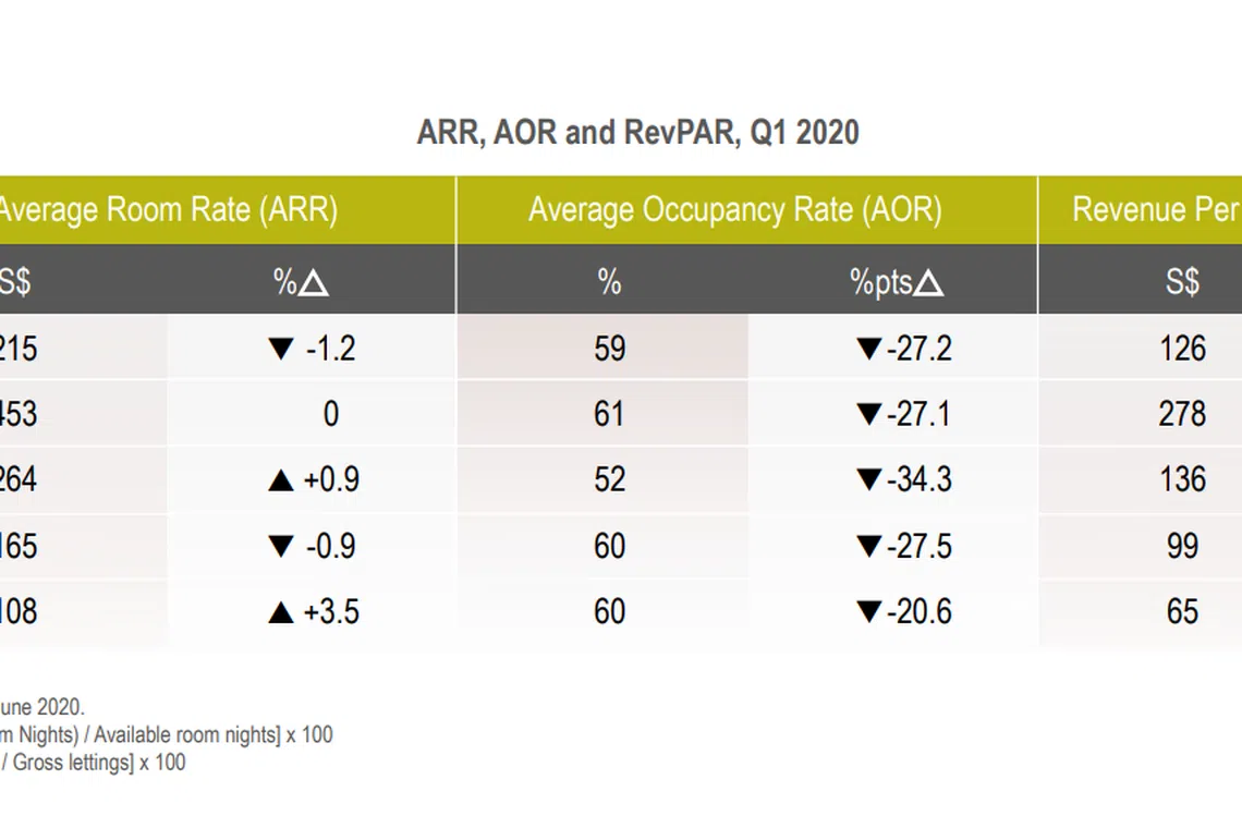 This came as the average occupancy rate was 27.2 percentage points lower at 58.6 per cent for the quarter, while the average room rate edged down by 1.2 per cent to S$215. As a result, the revenue per available room slipped 32.5 per cent to S$126.
