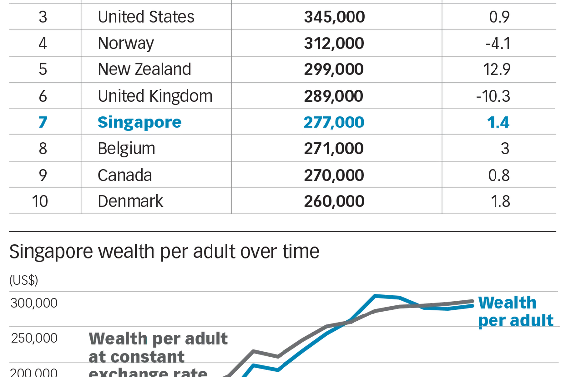 Personal wealth per adult here was up 1.4 per cent to US$277,000 in 2016, taking the seventh position globally among major economies. Switzerland (US$562,000) led the top 10, followed by Australia (US$376,000) and the United States (US$345,000).