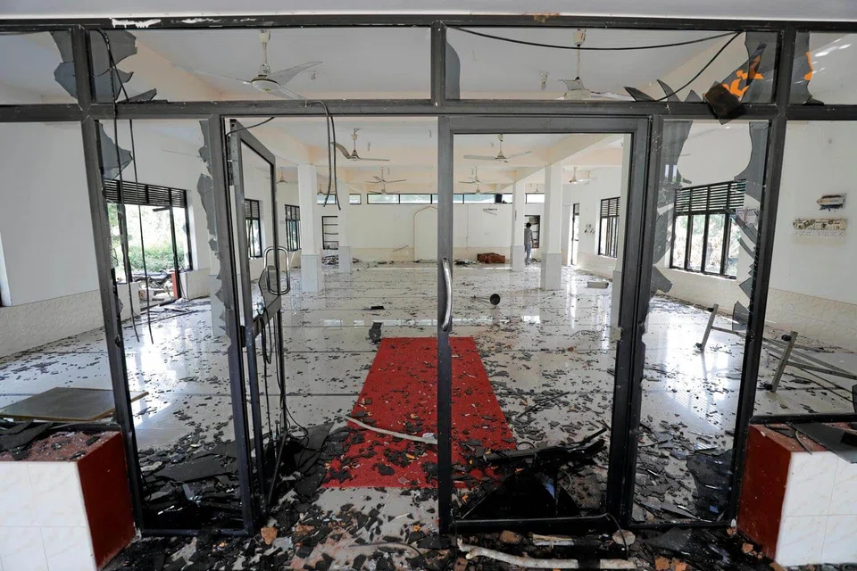 Glass was strewn across the Abrar mosque in the town of Kiniyama that was attacked overnight. All the windows and doors of the soft-pink building were smashed and copies of the Koran were thrown onto the floor.