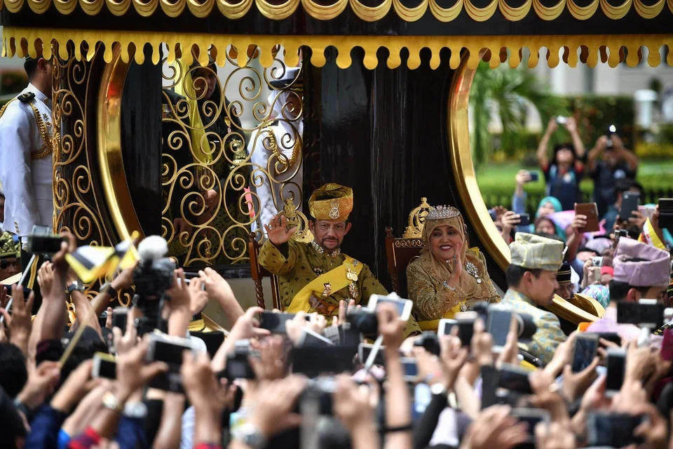 The sultan and other members of the royal family travelled through the streets in a convoy of Rolls-Royces before boarding the golden chariot, known as the Usongan Diraja, which has long been used for royal ceremonies in Brunei.