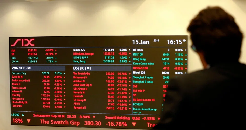 A contract that paid out should the benchmark Swiss Market Index drop to 8,150 by today from around 9,200 had no volume for the last week. That changed yesterday, when the Swiss National Bank's move to abandon its currency peg against the euro sent shock waves through markets. A rout in Swiss equities spurred traders to snap up 4,300 of the puts in a matter of hours, sending the price soaring from a few centimes to more than 15 francs - a jump of about 15,000 per cent.