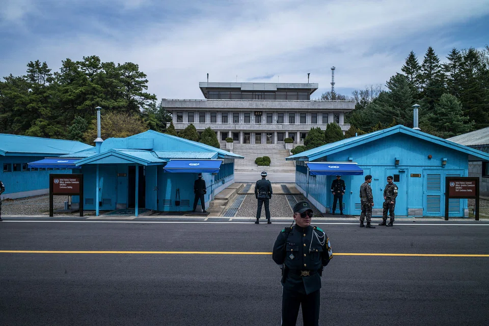 The village of Panmunjom, also known as the Joint Security Area, lies inside the Demilitarized Zone, a buffer zone 1 1/2 miles wide that has divided the Korean Peninsula since the Korean War was halted in a truce in 1953. Panmunjom was originally created as a neutral area. But since North Korean soldiers wielding axes killed two US Army officers there in 1976, it has been divided by a demarcation line like the rest of the DMZ, with armed guards from both sides engaged in a tense, daily standoff.