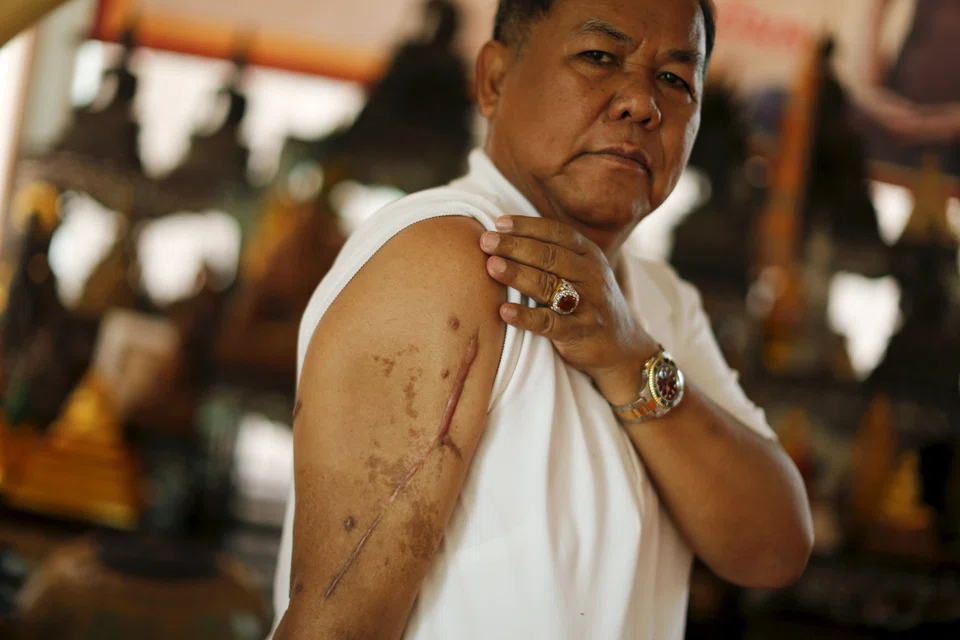 The reference to playing dead resonated with Mr Kwanchai, who rolled up his sleeve to show a scar the length of his upper arm from a drive-by shooting at his rural home when Bangkok was paralysed by protests that preceded the coup.
