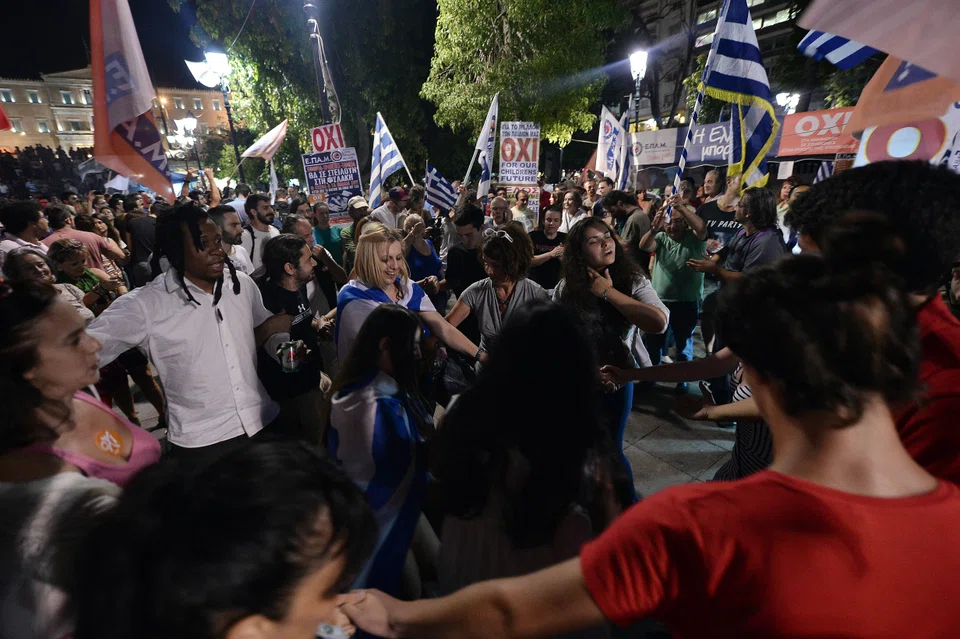 At Syntagma square in central Athens, several thousand people waved "No" banners and chanted, "they will never win," as the results of the referendum trickled in. Families wrapped themselves in the Greek flag and danced to traditional tunes, while others set off fireworks above the square's blue-tinted fountain. "The 'No' message is that we're not scared after all the pressure that have we have faced from both Europe and inside our country," said Stathis Efthimiadis, a 47-year-old schoolteacher.
