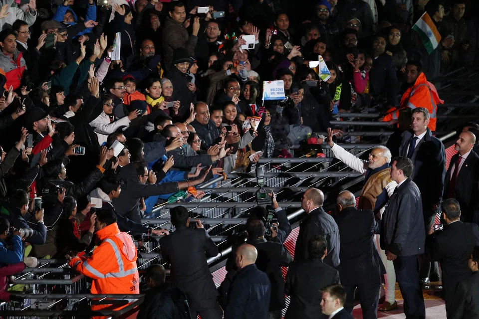 Members of Britain's large Indian diaspora waved India's tricolour flag, wore Modi masks and chanted Mr Modi's name between blasts of Indian pop music that had the crowd dancing in the aisles of Wembley Stadium Slick videos highlighted India's economic prowess, in a muscular production underscoring the country's shift from British colonial possession to a global power courted for its vast markets, deep-pocketed investors and strategic importance.