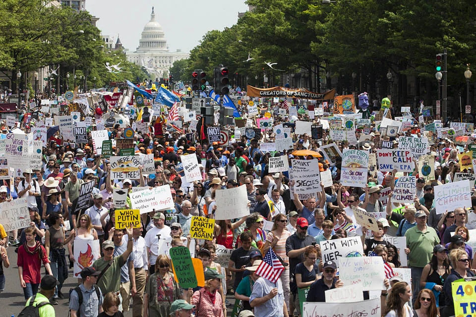 TENS of thousands of demonstrators, alarmed at what they see as a dangerous assault on the environment by the Trump administration, poured into the streets of Washington on Saturday to sound warnings both planetary and political about the Earth's warming climate.