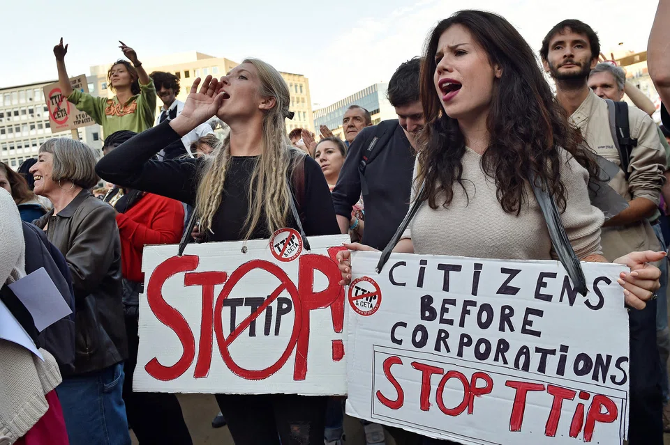 The protests came after mass rallies in German cities on Saturday against the European Union's planned Transatlantic Trade and Investment Partnership (TTIP) with the United States, and the Comprehensive Economic and Trade Agreement (CETA) with Canada.