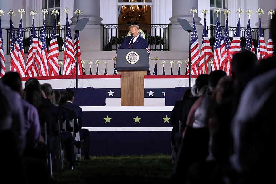 Despite the pandemic that has killed more than 180,000 Americans, Mr Trump delivered his remarks before a crowd of more than 1,000 people, standing in front of dozens of American flags and basking in chants of "Four more years!" and "USA!"